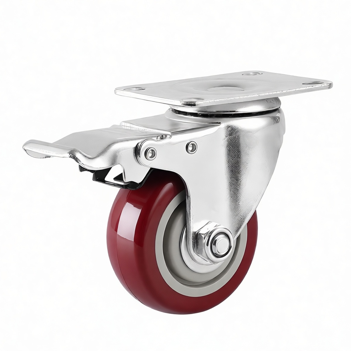 Ideal for use on industrial material handling carts, assembly line trolleys, and mobile workstations. Suitable for warehouse logistics equipment, hospital supply carts, and light manufacturing machinery that requires frequent repositioning. The design supports operations in food processing facilities, electronics assembly areas, and general maintenance workshops where floor integrity and operational silence are prioritized. Commonly deployed on shelving units, portable storage racks, and automated guided vehicle retrofits needing stable, lockable mobility solutions.