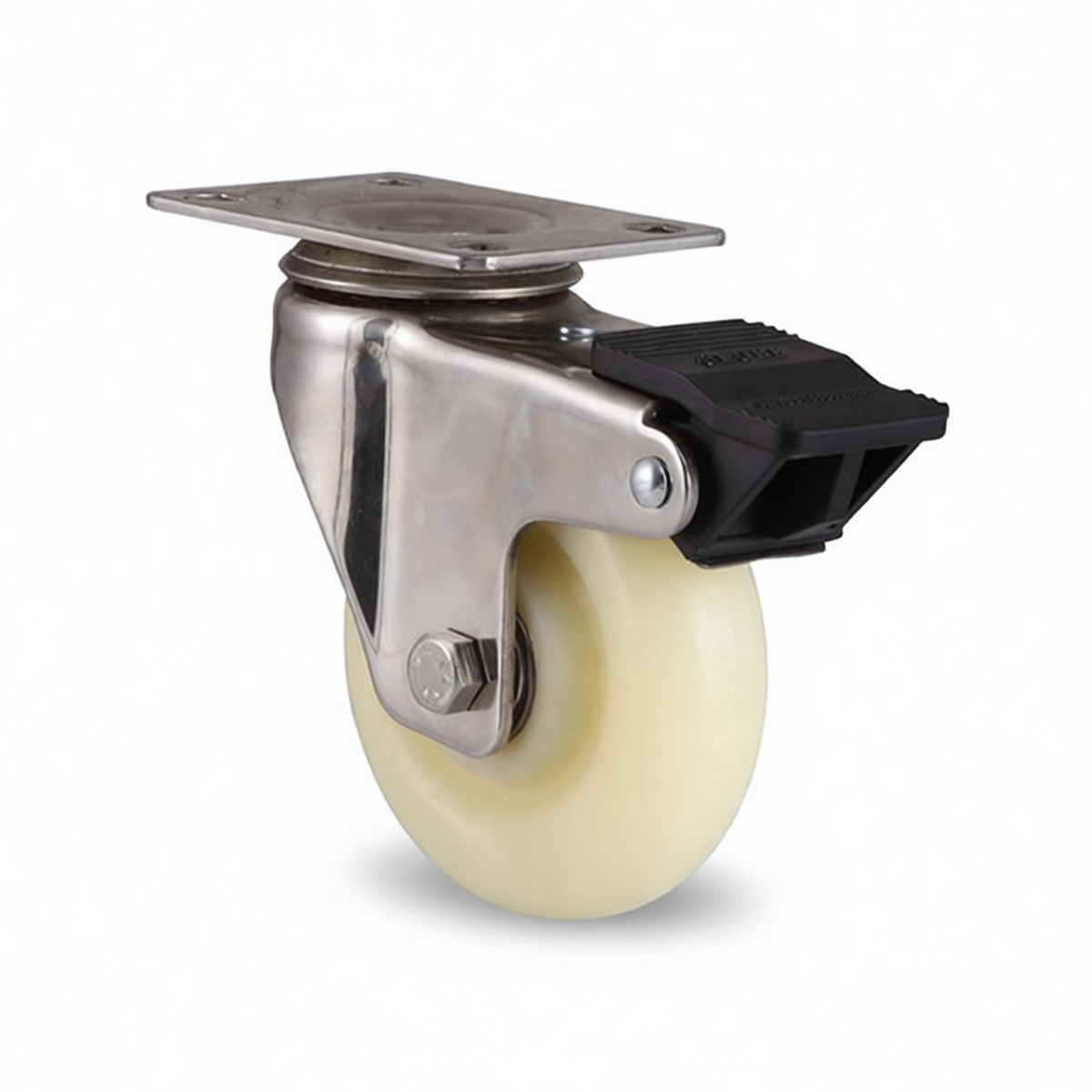 Constructed from premium 304 stainless steel for maximum durability and rust resistance High-grade nylon wheel material offers excellent wear resistance and floor protection Rated load capacity of 220 lbs to support heavy industrial loads Smooth rolling performance optimized for both hard and semi-soft flooring Corrosion-resistant design suitable for wet, acidic, or caustic environments Secure plate mount interface ensures stable installation and reduced wobble Low maintenance requirements due to sealed bearing construction Ideal for environments requiring frequent sanitation or exposure to moisture
