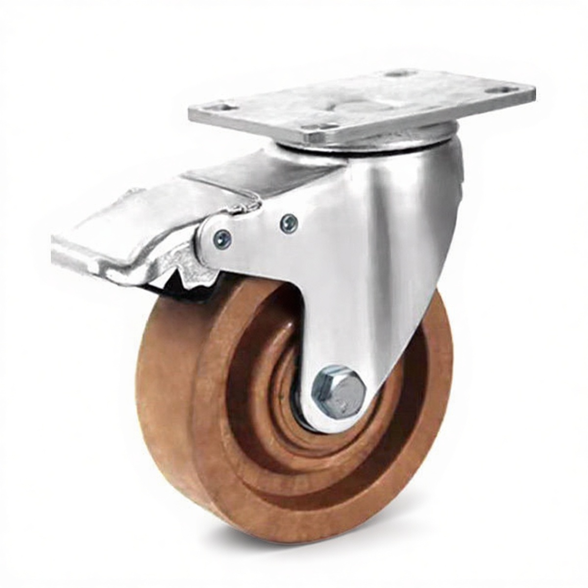 This heavy-duty plate mount caster is engineered for rigorous industrial applications where stability, heat resistance, and secure positioning are paramount. Designed to support substantial loads in demanding environments, the unit features a wheel constructed from glass-fiber reinforced nylon. This specialized material composition ensures exceptional structural integrity even when exposed to elevated temperatures, preventing deformation or failure under stress. The integrated braking mechanism provides reliable locking capability, ensuring equipment remains stationary during loading, unloading, or maintenance operations. With a robust build quality and precise engineering, this caster offers a long service life for factory machinery, commercial ovens, and heavy transport carts.