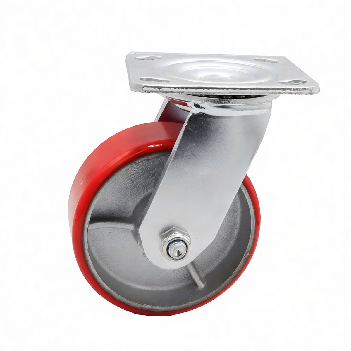 High load capacity rated at 660 lbs per caster Red polyurethane tread prevents floor marking and reduces noise Durable iron core provides superior structural strength 360-degree swivel action for effortless maneuverability Plate mount design ensures secure and stable installation Resistant to oils, greases, and common industrial chemicals Maintains shape and performance under continuous static and dynamic loads