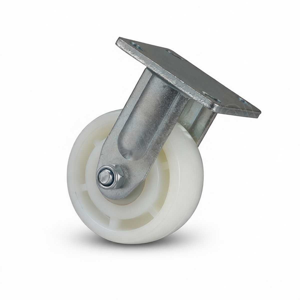 High-strength nylon wheel tread resists chemicals, oils, and floor debris Rigid fixed-wheel design ensures stable, straight-line tracking Heavy-gauge steel fork and housing provide superior structural integrity Plate mount installation allows for broad surface attachment and enhanced stability Smooth rolling performance reduces operator effort and equipment strain Excellent floor protection prevents marking or damage to concrete and epoxy surfaces Corrosion-resistant finish extends service life in harsh industrial conditions