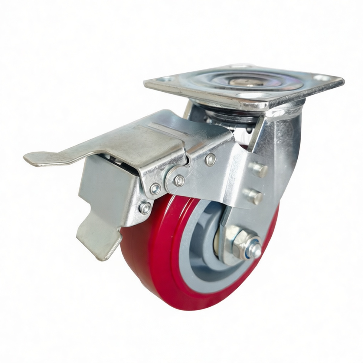 Static load capacity rated up to 836 lbs per unit Integrated swivel brake mechanism for secure locking Durable red PVC wheel construction resists wear and chemicals Smooth rolling performance on concrete, epoxy, and tile floors Heavy-gauge steel mounting plate for structural integrity 360-degree swivel action for superior maneuverability Non-marking wheel surface protects sensitive flooring