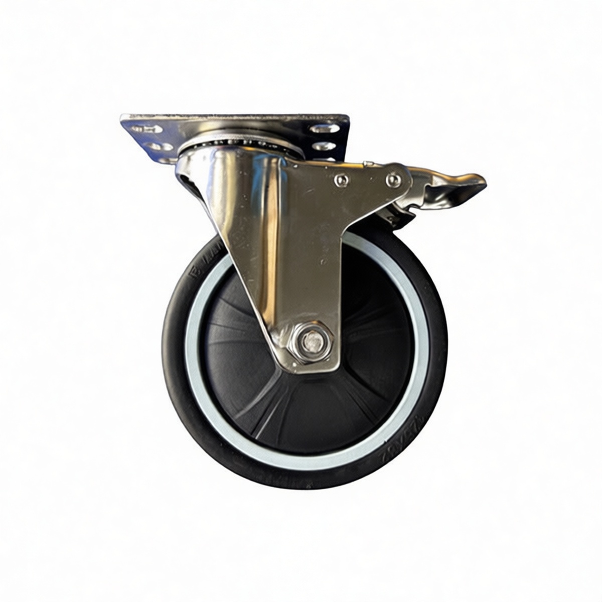 handling carts, and large equipment assemblies. The integrated braking mechanism provides immediate locking capability to prevent unintended movement during loading, unloading, or stationary operation. Constructed with high-grade polyurethane, the wheel offers superior floor protection by minimizing scuff marks while ensuring quiet, smooth rolling across various surface types. Its resistance to abrasion, oils, and common industrial chemicals ensures long-term durability even in harsh working conditions. The compact overall footprint allows for easy integration into existing equipment designs without compromising structural integrity or maneuverability.