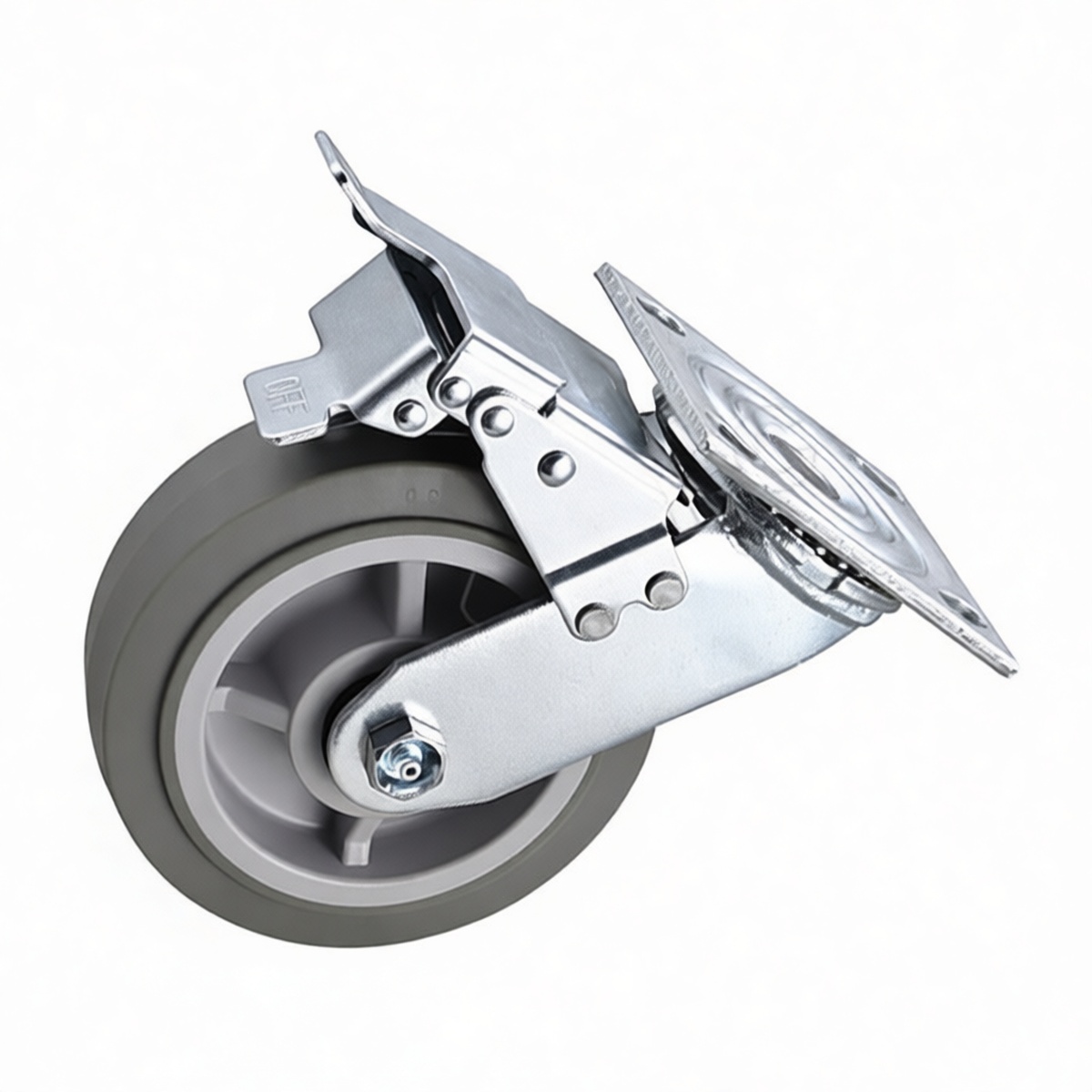 6-inch TPR wheel designed for silent rolling and non-marking floor contact Maximum load capacity of 594 lbs per unit for heavy industrial applications Integrated swivel brake for secure locking and stable positioning Robust all-steel construction for superior durability and impact resistance Low-profile overall height of approximately 7.5 inches for equipment clearance Precision ball bearing raceway for smooth 360-degree rotation Resistant to chemicals, oils, and typical industrial solvents
