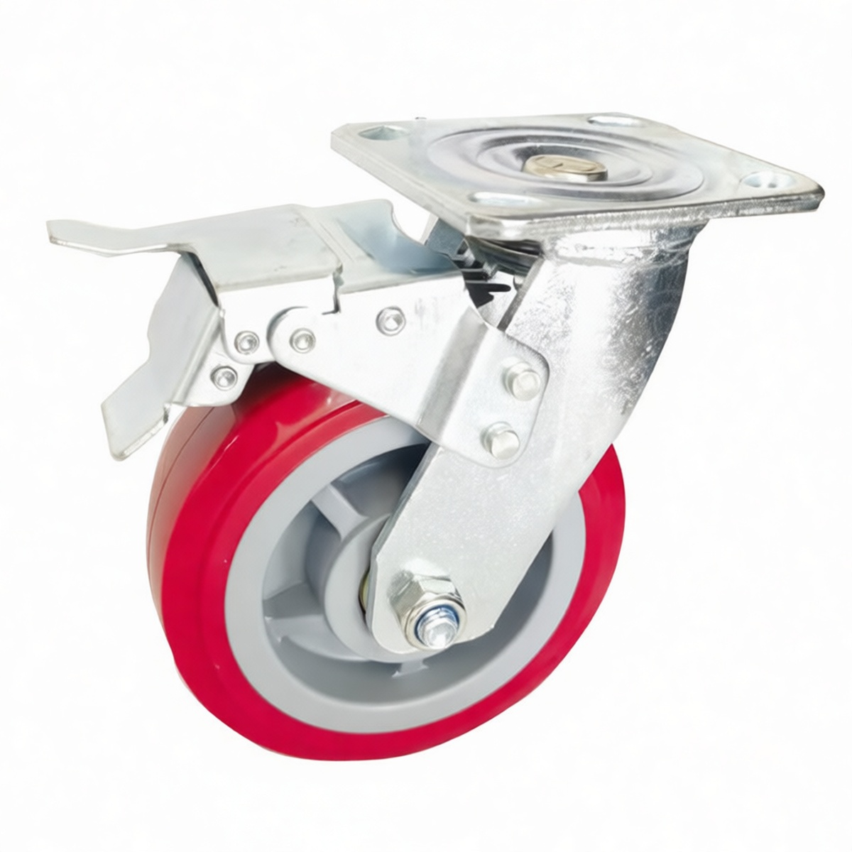 Load capacity rated at 924 lbs per caster Durable red PVC wheel resists chemicals, oils, and water Integrated brake system for secure stationary positioning Precision ball bearing swivel for smooth 360-degree rotation Non-marking tread protects sensitive warehouse flooring Robust steel mounting plate with four-bolt attachment pattern Resists flat-spotting under prolonged static loads Suitable for use on concrete, epoxy, and tile surfaces