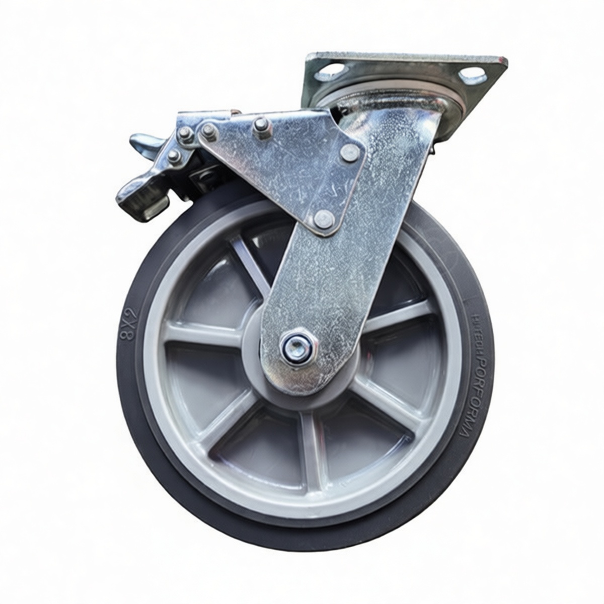 Double axis stem mechanism for improved stability and steering control 8-inch wheel diameter optimized for rolling over minor obstacles and debris Synthetic rubber tread ensures silent operation and floor protection High load rating of 350 lbs per caster for heavy industrial use Robust construction designed for long-term durability in harsh environments Package includes two units for immediate replacement or dual installation Superior traction on wet, dry, or oily factory floors
