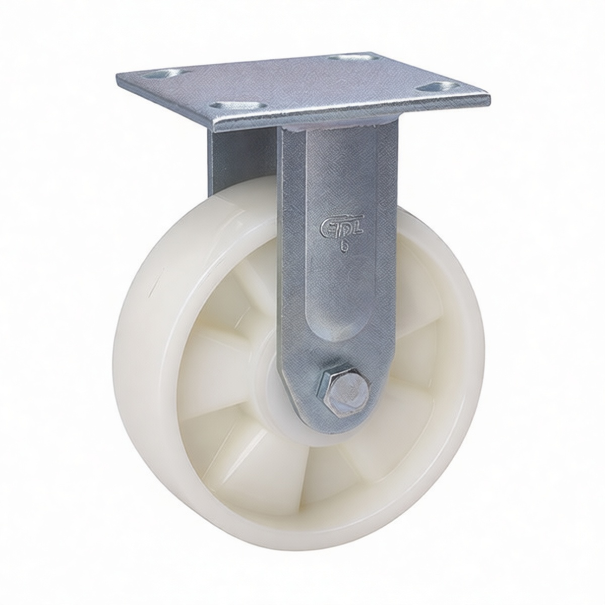 Engineered for demanding industrial environments, this heavy-duty plate mount caster supports a static load capacity of 924 lbs. The unit features a robust 5.9-inch diameter nylon wheel with a 2-inch tread width, offering superior floor protection and chemical resistance. Designed with an overall installation height of 7.5 inches, it utilizes a rigid mounting plate measuring 4.6 x 3.9 inches for secure attachment to equipment frames. This non-swivel configuration ensures stable, straight-line tracking under significant weight, making it ideal for stationary path applications in manufacturing and logistics facilities.