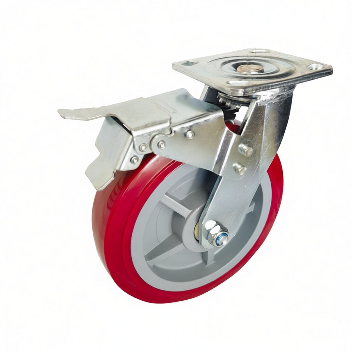 Engineered for demanding industrial environments, this heavy-duty plate mount caster delivers exceptional load-bearing capacity and maneuverability. The unit features an 8-inch PVC wheel specifically designed to support static loads up to 992 lbs per caster. Constructed with a robust polyolefin housing, the assembly ensures long-term durability while providing a non-marking surface that protects sensitive factory flooring from scuffs and damage. The integrated swivel mechanism allows for smooth 360-degree rotation, facilitating easy navigation of tight corners and complex pathways in warehouses and manufacturing facilities. An included reliable braking system locks both the wheel and the swivel head simultaneously, ensuring precise positioning and enhanced safety during loading, unloading, or stationary periods.