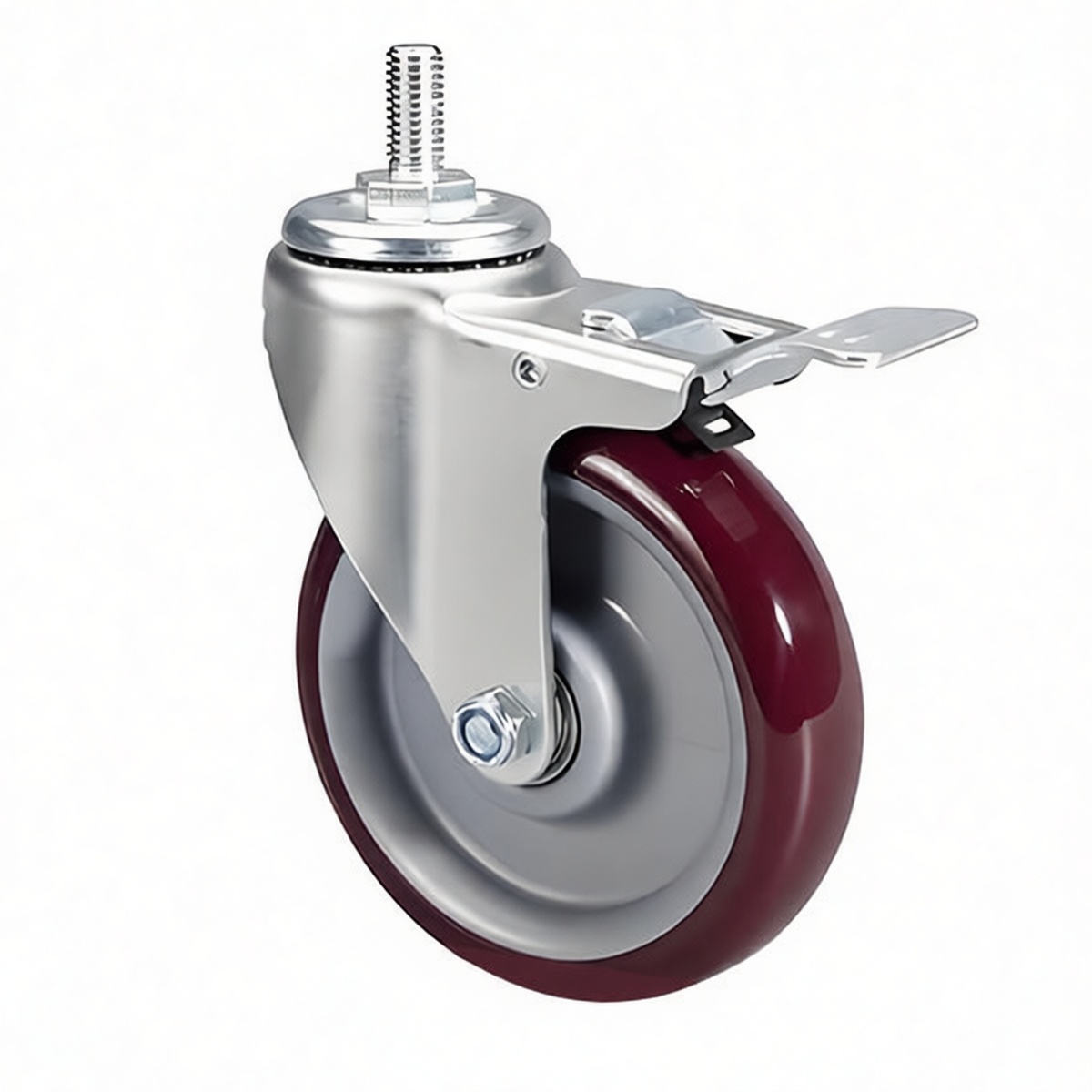 5-inch wheel diameter optimized for rolling over minor debris and uneven surfaces Cast iron core construction provides structural integrity under heavy stress Polyurethane tread offers high abrasion resistance and non-marking performance Dual-brake system locks wheel roll and swivel pivot concurrently for total immobilization Precision ball-bearing raceway enables smooth omnidirectional movement Threaded stem mounting allows for secure and rapid installation onto existing equipment Arc-shaped tread profile distributes weight evenly to minimize floor damage Rated for a static load capacity of 300 lbs per individual caster