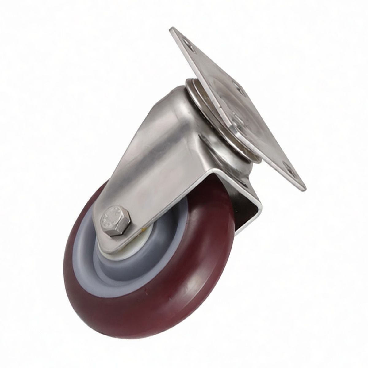 Corrosion-resistant stainless steel construction for harsh washdown environments 90 lbs load capacity per caster for stable light-to-medium duty transport 3.0-inch polyurethane wheels ensure silent operation and floor protection Universal stem type fits standard mounting sockets without adapters Non-marking wheel compound prevents black streaks on tile and epoxy floors Smooth-rolling precision bearings reduce push effort and operator fatigue Compact overall footprint of approximately 3.6 inches by 2.5 inches