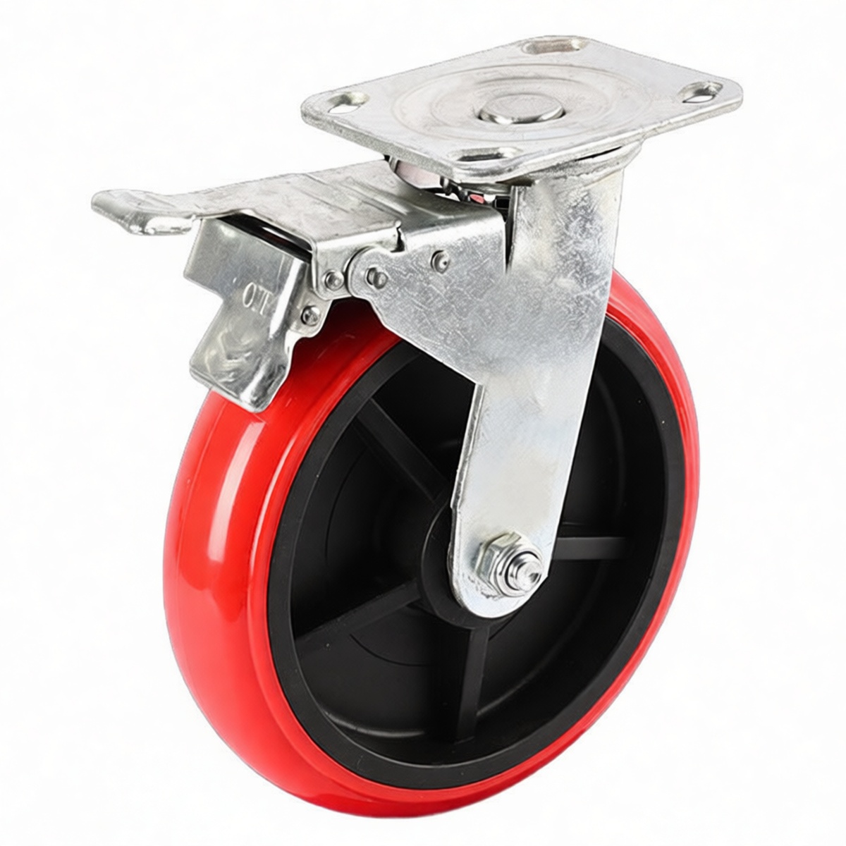 handling equipment. The integrated braking mechanism allows operators to securely lock the wheel in place, ensuring precise positioning and enhanced workplace safety during loading or stationary operations.